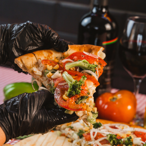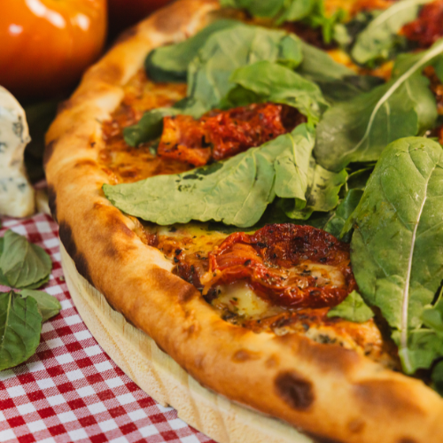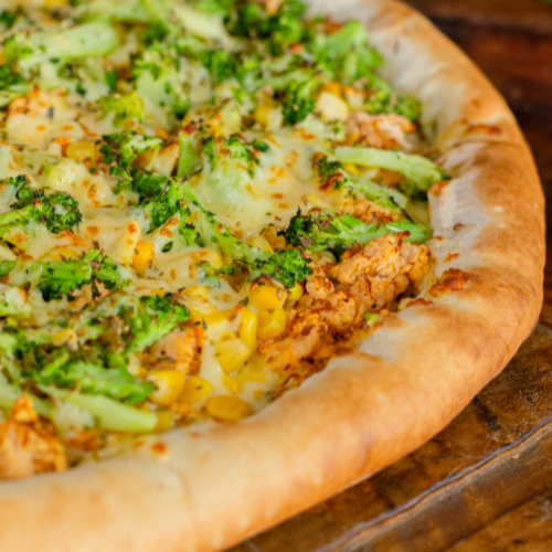 Muçarela, palmito, tomate, peito de peru, champignon, brócolis, cebola e orégano