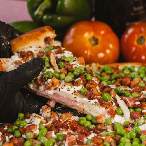 Muçarela, ervilha, presunto, palmito em rodelas, creme de leite, bacon e orégano